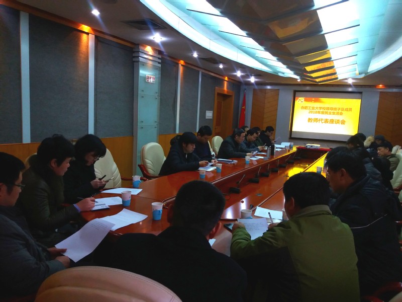 2019年1月4日下午三点整,在学术会议中心第一会议室,由党委教师工作部(人事处)负责组织举行的“合肥工业大学校领导班子及成员2018年度民主生活会教师代表座谈会”准时召开。会议由党委教师工作部(人事处)部(处)长朱华炳主持,人事处副处长郑利平、22位教师代表及人事处相关人员参加了座谈会。